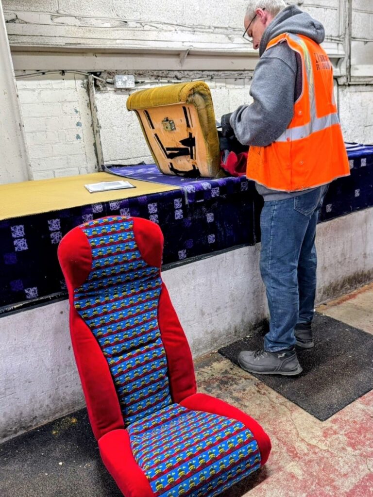 Pupils from Oastlers School in Bradford – including Seat-y competition winner Khyreece went to Diamond Rail Services on Wednesday 11th March to watch the moquette produced by Camira get fitted to the 30 seats that will fill an LNER 225 carriage at the end of the month.
